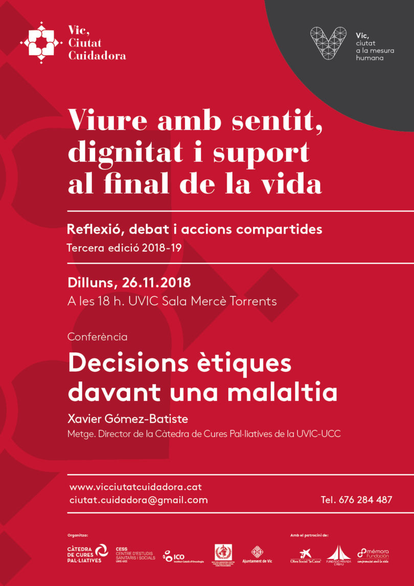 Dins el projecte Vic Ciutat Cuidadora, us informem de la conferència “Decisions ètiques davant una malaltia”, que es realitzarà el dilluns 26 de novembre a les 18.00 h a la UVIC, Sala Mercè Torrents; una conferència que anirà càrrec del Dr. Xavier Gómez-Batiste i que compte amb la col·laboració de l’Hospitalitat de la Mare Déu de Lurdes.