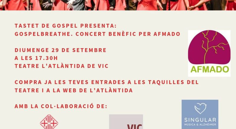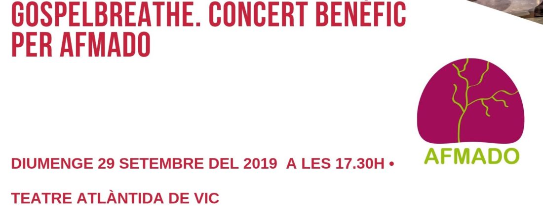 Ens complau a convidar-vos al “GospelBreathe: concert benèfic per AFMADO” el proper diumenge 29 de setembre del 2019 a les 17.30h al Teatre Atlàntida de Vic. Entrades a la venta a partir del 9 de setembre a les taquilles i a la web de l’Atlàntida. Us hi esperem!!!